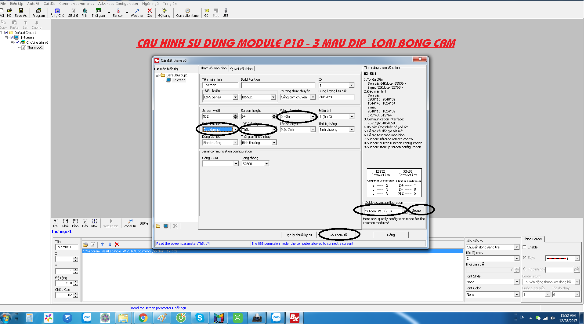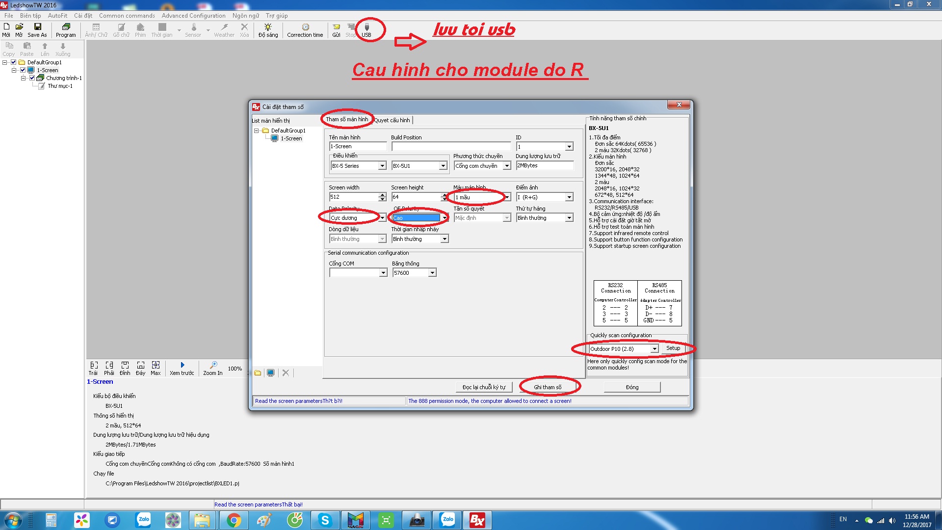 Tiếp theo lưu lại cấu hình ấn vào biểu tượng P10 2.8 và Setup > Ghi tham số . Sau đó tắt phần mềm đi tiến hành viết nội dung và lưu tới USB cắm vào mạch là ok